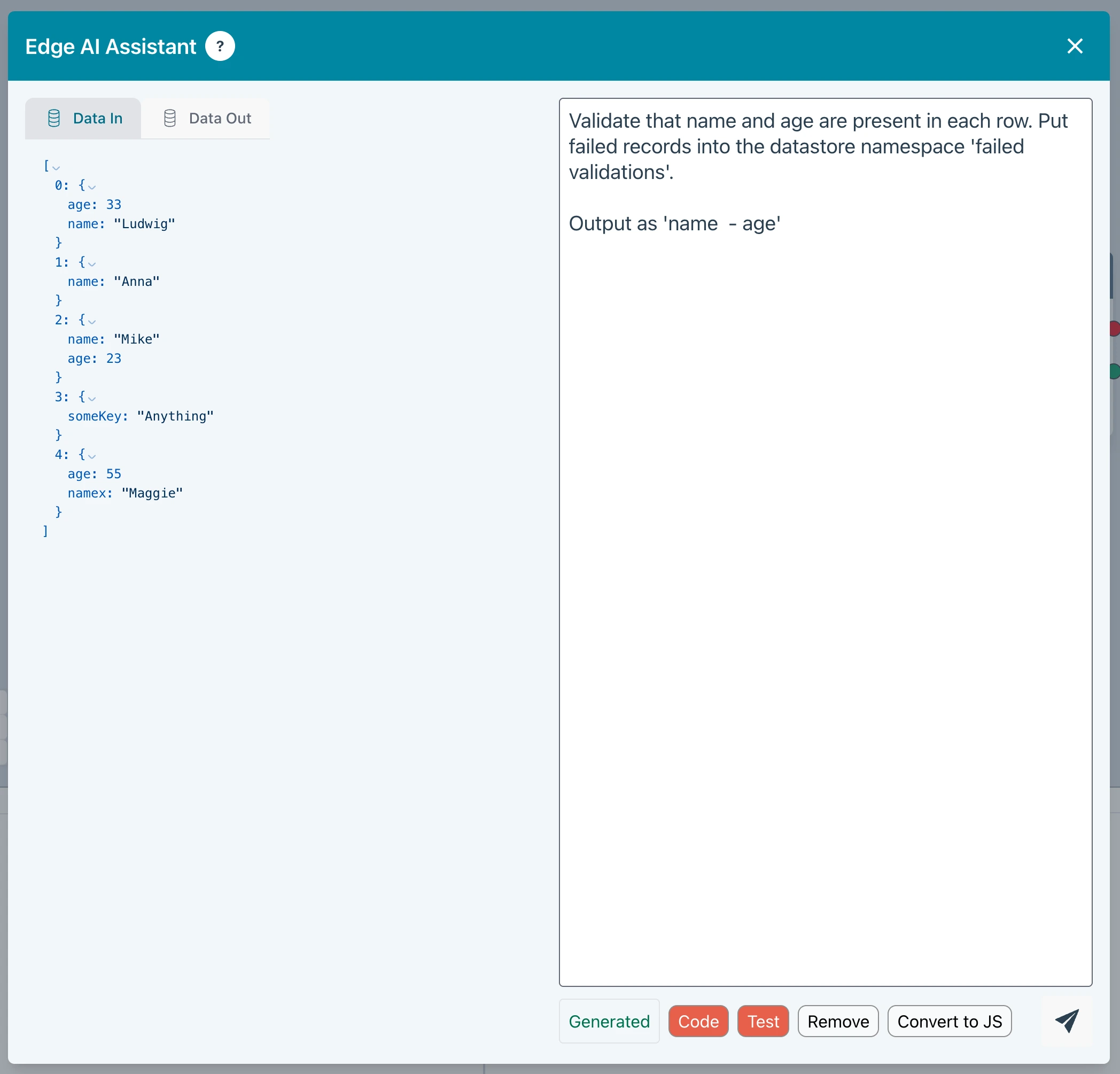Ziggy offers several AI and dialog driven ways to validate and transform data in a flow